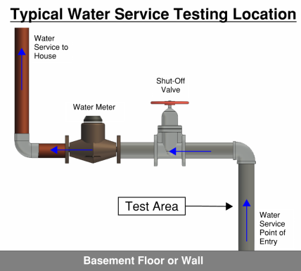 1. Your inspector will arrive between noon and 8 PM and will request access to where your water service line enters your home. Your service line carries water to your house from the water main and can typically be accessed in a basement between a wall or floor and your water meter. See the image to the right to see the area the inspector will be focused on.